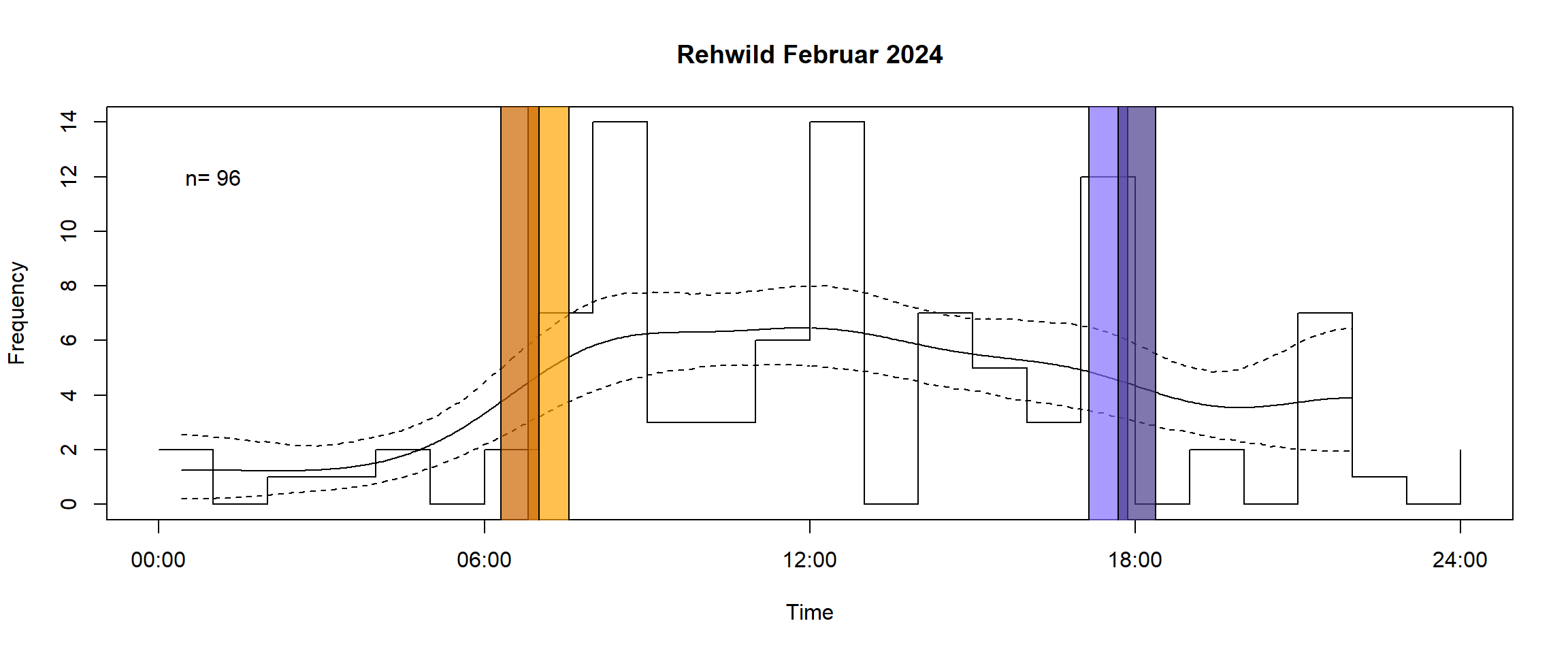 Die Aktivität des Schalenwildes wird anhand der Uhrzeit und der Häufigkeit der Sichtungen bestimmt. Alle Zeitangaben sind im Format UTC+1, also Winterzeit. In der vorliegenden Untersuchung wird die Aktivität für alle Sichtungen vor den Kameras in einer Entfernung von 10 m zur Kamera dargestellt. Die Fläche unter der geglätteten Kurve beschreibt den Anteil des Tages, in dem das Wild durchschnittlich aktiv war. Innerhalb des Untersuchungszeitraums verändern sich die täglichen Zeitpunkte des Beginns der Morgendämmerung, des Sonnenaufgangs, des Sonnenuntergangs und des Endes der Abenddämmerung kontinuierlich. Die farbigen Bereiche markieren die jeweiligen Spanne dieser Zeitpunkte im Untersuchungszeitraum.