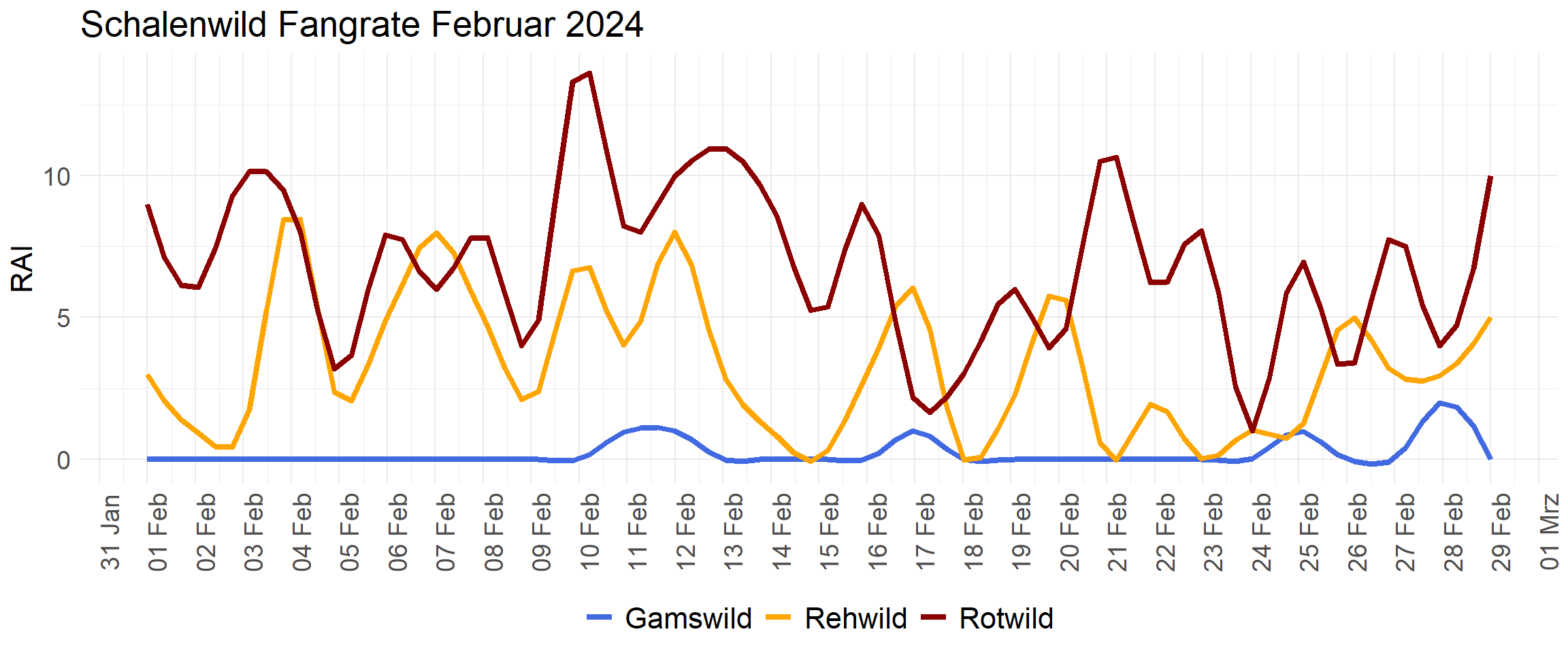 Der monatliche Verlauf der Fangraten (= RAI, Relative Abundance Index) für die drei Schalenwildarten ist in der folgenden Abbildung dargestellt. Die Fangrate wird als Anzahl Sichtungen pro 100 Kameratage berechnet.