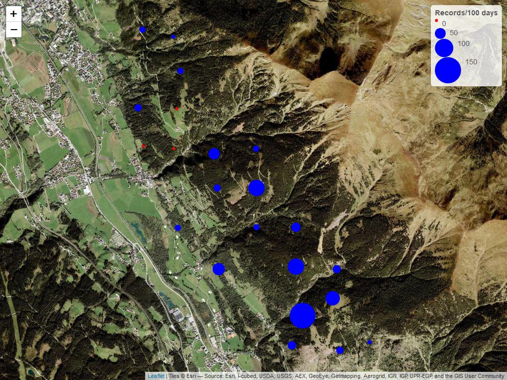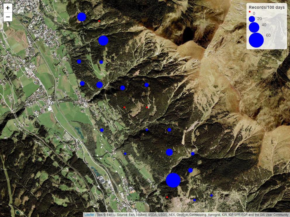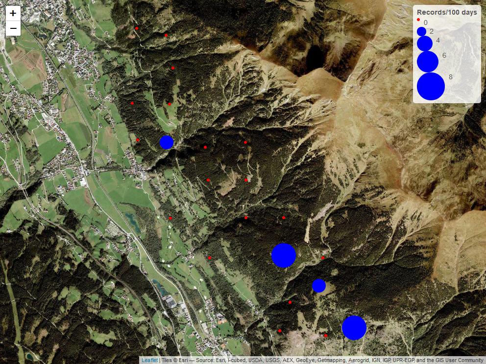 Der Relative Abundanz Index (RAI) beschreibt die Fangrate mit Hilfe der Anzahl Sichtungen pro 100 Kameratagen. Jede Karte kann über den angefügten Link in einem eigenen Fenster geöffnet werden. Hier können für jeden Standort die genauen Informationen abgefragt werden (mit dem Cursor auf den jeweiligen Punkt fahren).