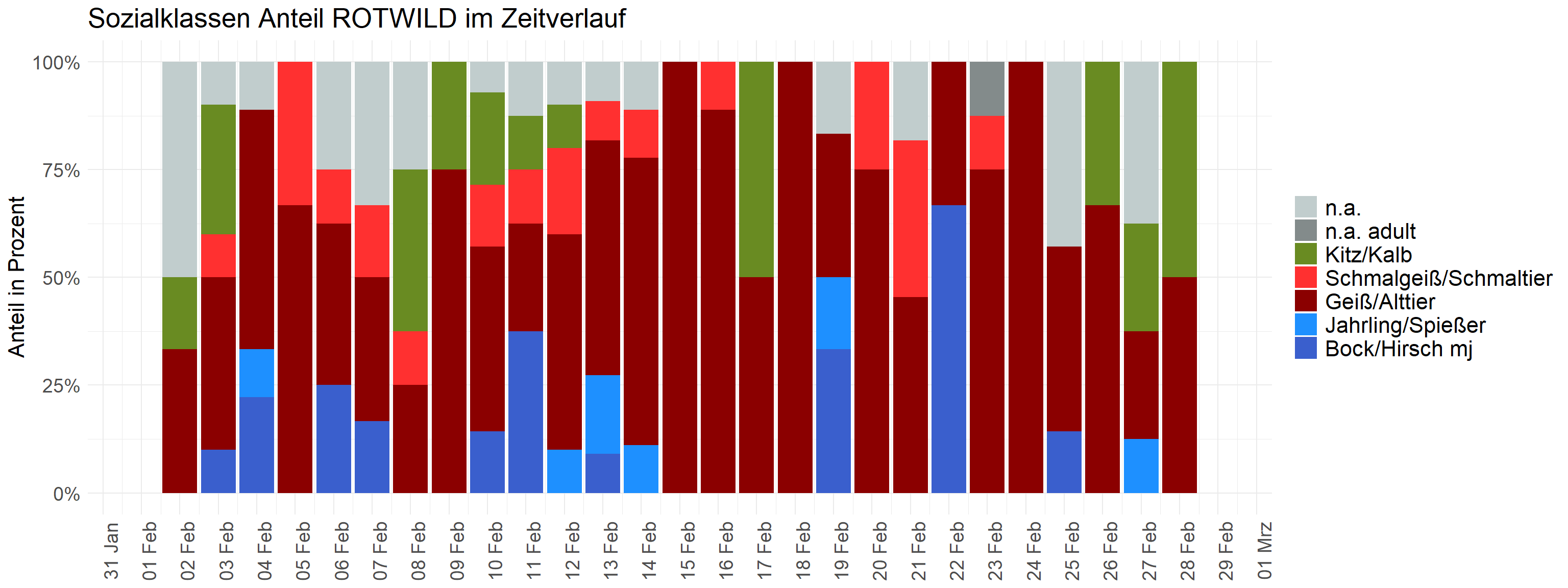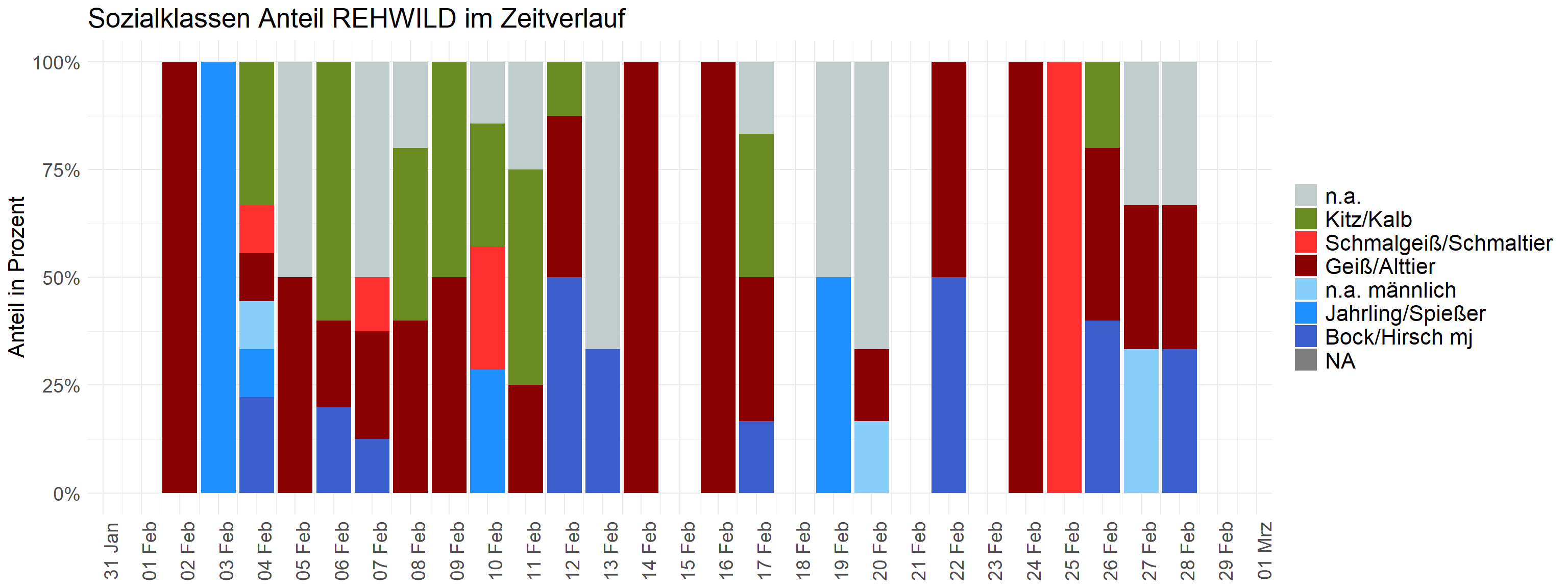 Die Sozialklassenanteile lassen sich auch in einem zeitlichen Verlauf darstellen. In den folgenden Abbildungen ist dieser Verlauf für den aktuellen Untersuchungszeitraum für Reh- und Rotwild dargestellt: