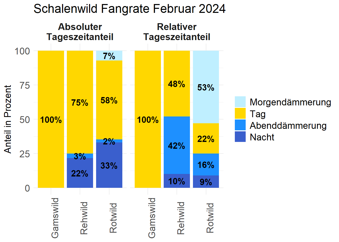 Die Tag-/Nachtaktivität einer Tierart kann anhand der Anteile aller Fotofallen-Sichtungen an einer der vier Tageszeiten definiert werden. Die Einteilung der vier Tageszeiten basiert auf den standortspezifischen Zeiten für Sonnenaufgang, Sonnenuntergang, zivile Morgendämmerung und zivile Abenddämmerung.